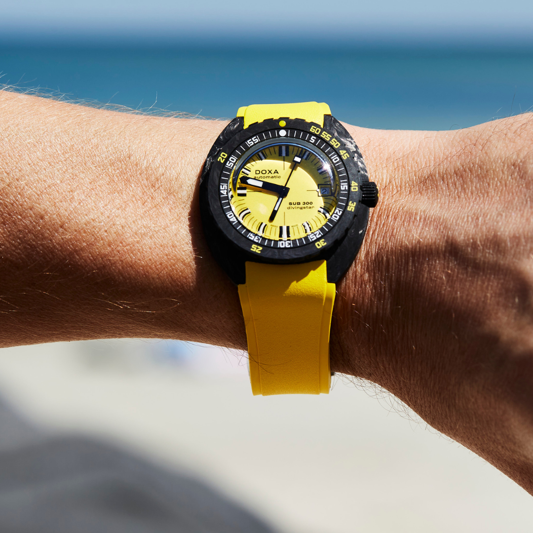 SUB 300 Carbon er tilgjengelig i 7 urskivefarger, og du kan velge om du vil ha en gummirem som matcher urskiven eller standarden med gummirem i svart. Gummiremmen er utstyrt med en svart PVD-behandlet folding clasp dekorert med det eksklusive DOXA-fiskesymbolet, og du finner de karakteristiske DOXA-symbolene på begge sider av remmen. Gummiremmen har også en justerbar våtdraktsforlengelse som tilpasser seg tykkelsen på våtdrakten.