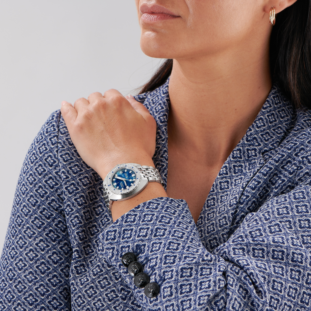 Designed with a refined 39mm case and 10.70mm thickness for comfort, the watch features a 316L stainless steel construction, Swiss automatic movement, 38-hour power reserve, and elements like a date window, unidirectional rotating bezel, and screw-down crown. It’s water-resistant to 200 meters, with a scratch-resistant sapphire crystal and Super-LumiNova® coating for optimal readability. The enhanced dial with applied hour markers adds a touch of sophistication, highlighted by the sparkle of the mother-of-pearl dial.