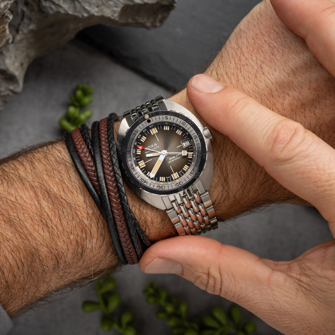 The SUB 250T GMT marks DOXA’s return to the GMT function, blending dive-watch durability with world-time functionality. Its 40mm stainless steel case ensures a perfect balance of wrist presence and comfort, while the screw-down crown and unidirectional bezel with diving scales provide professional-grade performance. With a water resistance of 250 meters (820 feet), it’s built for both underwater exploration and global travel.