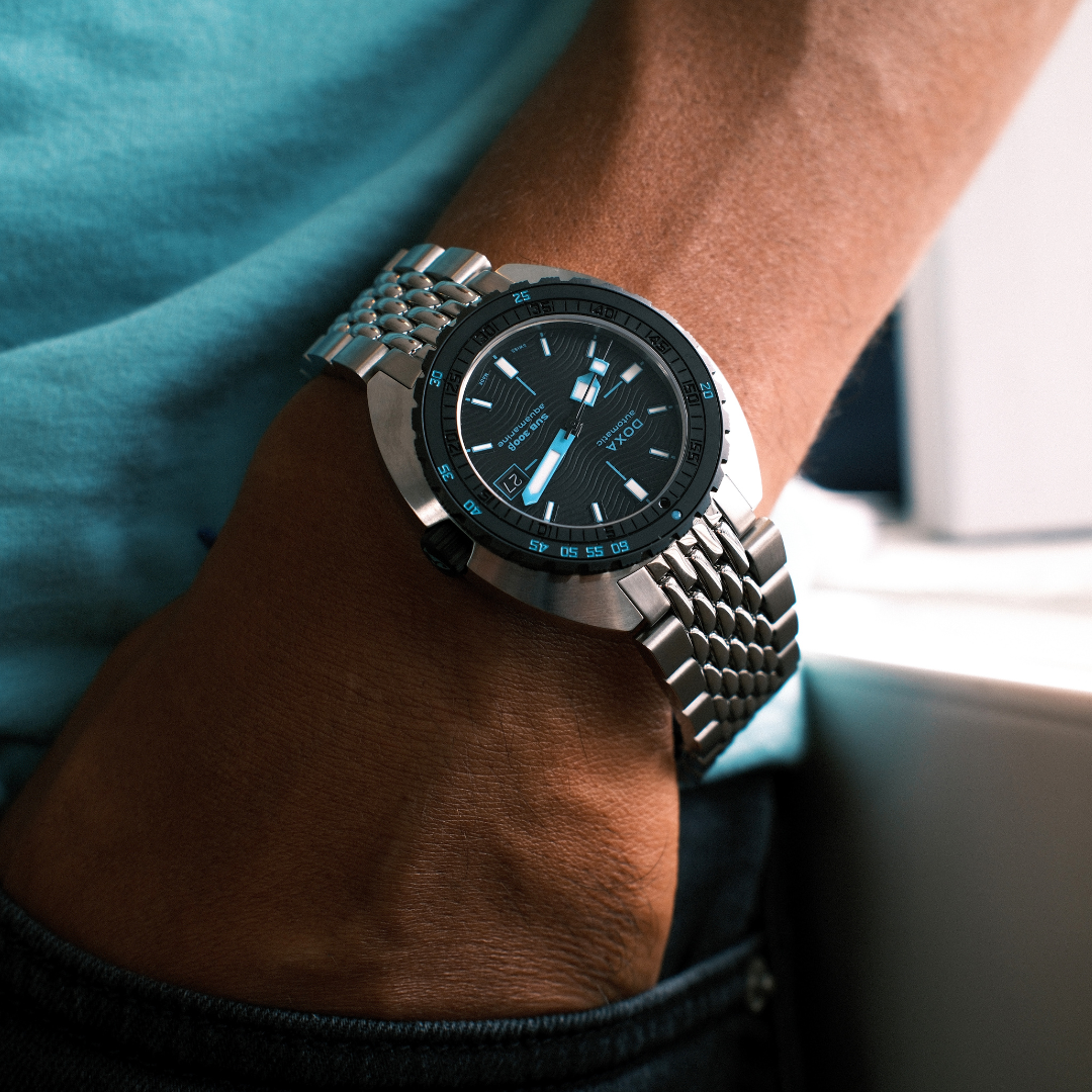 The SUB 300β sports watch combines functionality with style, maintaining foundational tool watch features in a redesigned 42.5 mm diameter case, now slimmer at 11.95 mm. The black ceramic bezel and screw-down crown enhance its sport-chic character, complemented by a sophisticated sunburst dial finish. Available with an FKM rubber strap or stainless-steel "Beads of Rice" bracelet, both featuring a ratcheting folding clasp, the watch is water-resistant up to 300 meters. With a scratch-resistant sapphire crystal, Swiss automatic movement, and a power reserve of around 38 hours, the SUB 300β is engineered for safety and exploration. True to DOXA's unconventional ethos, it blends the spirit of the times with an elegant, modern sport-chic look suitable for urban settings.
