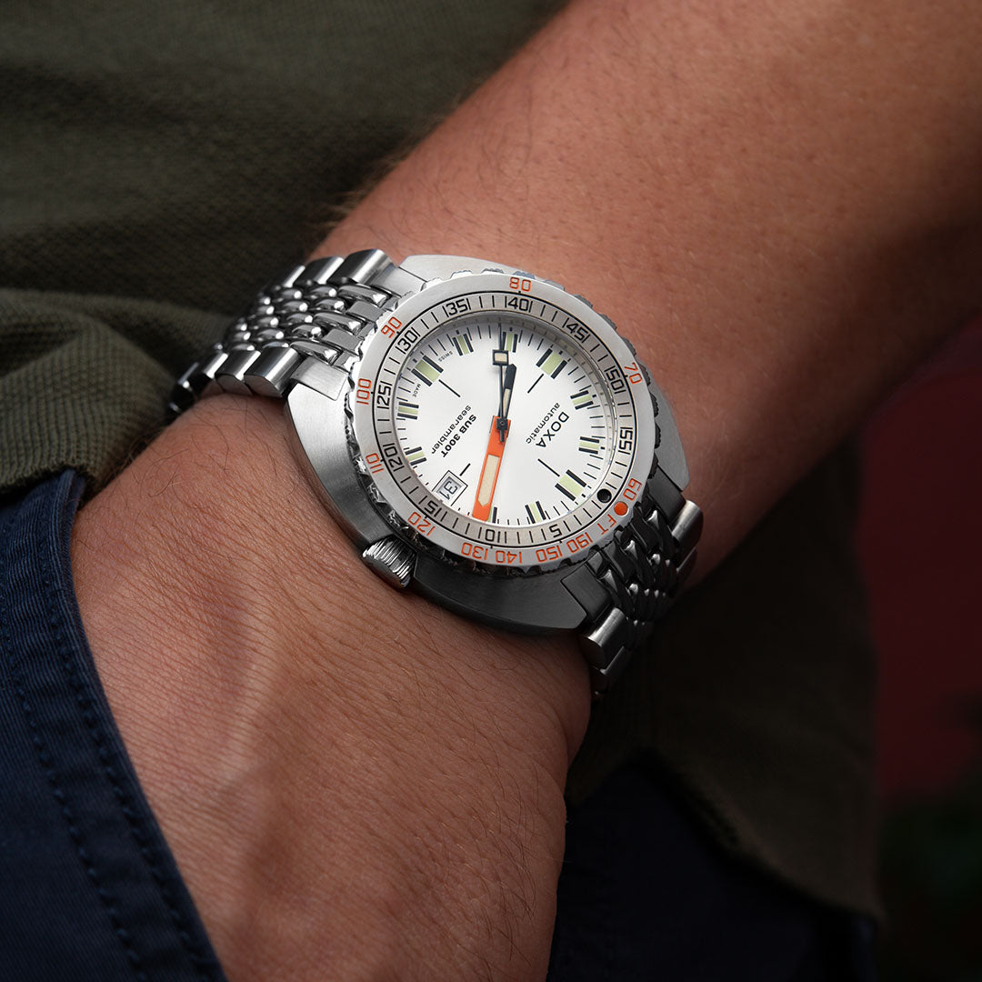This 3-hand diver's watch, available in 8 dial colors, combines the aesthetic genes of the SUB 300T Conquistador with the technical refinements that define the high-performance diver's watch of today. Constructed from 316L stainless steel of the highest quality, the SUB 300T has a diameter of 42.5mm and a scratch-resistant sapphire crystal with an anti-reflective coating. Rated to withstand pressures up to 120 bar, this diver is effectively waterproof to a depth of 1,200 meters and features the patented unidirectional rotating bezel with an integrated no-decompression dive time calculator. All elements providing dive-relevant information are highlighted with a Super‑LumiNova® luminescent insert to ensure optimal legibility underwater. The bracelet is 316L stainless steel and features a folding clasp with the DOXA fish symbol.